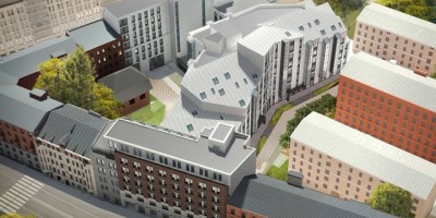 В конце лета, судя по снимку из космоса, приступили к созданию котлована под жилой дом (официально он именуется апарт-отелем). Он будет размещен во дворе. Спроектировано восьмиэтажное здание с ломаной кровлей уступами и белыми «скандинавскими» фасадами, на которых «повесят» эркеры-градусники.