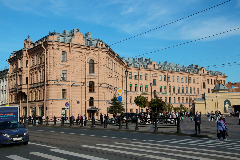 Здание на углу Садовой улицы и Сенной площади было построено в 1880 году по проекту Григория Карпова. Ломаными фасадами оно огибало стоявшую здесь Успенскую церковь (Спас на Сенной).