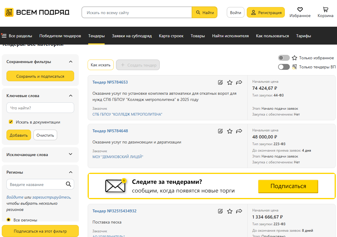 Здесь представлены актуальные заявки. Тендеры фильтруются по ряду признаков: