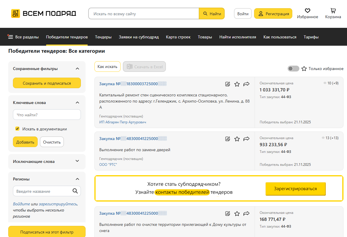 В этом разделе представлены компании, выигравшие конкурсы, которые тоже можно отсортировать по регионам, видам работ и иным признаком. Такая информация позволяет оценить важные аспекты строительного рынка: