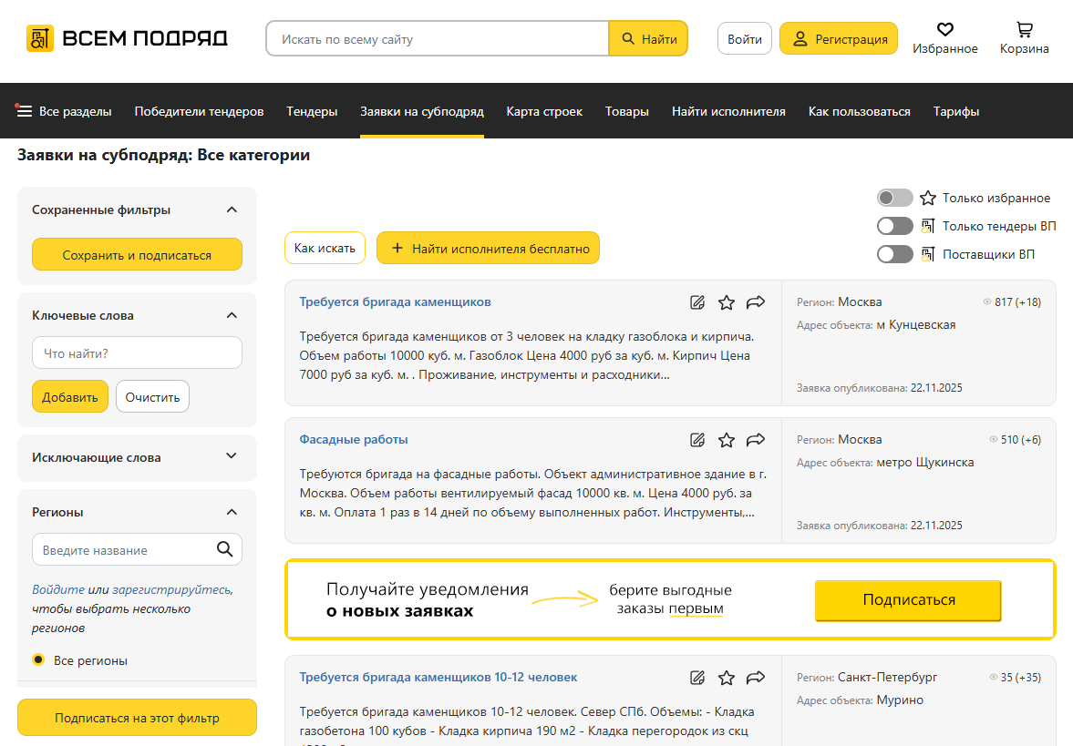 Данный раздел предназначен для поиска исполнителей с учетом конкретных задач, и подрядчики могут откликнуться на них, минуя сложные процедуры. Масштаб заказов варьируется от крупных, с которыми работают организации, до небольших, предназначенных для мастеров, работающих частным образом. Для публикации в разделе необходимо заполнить заявку на субподряд, указав следующие данные: