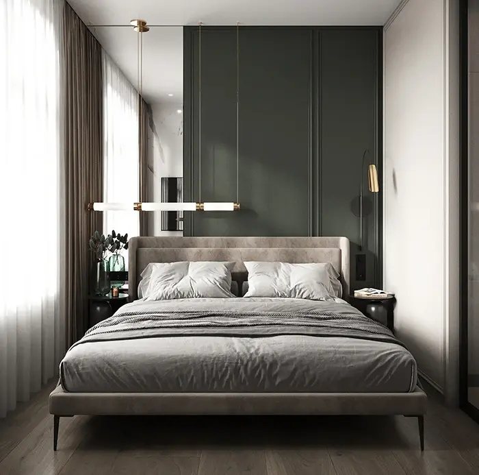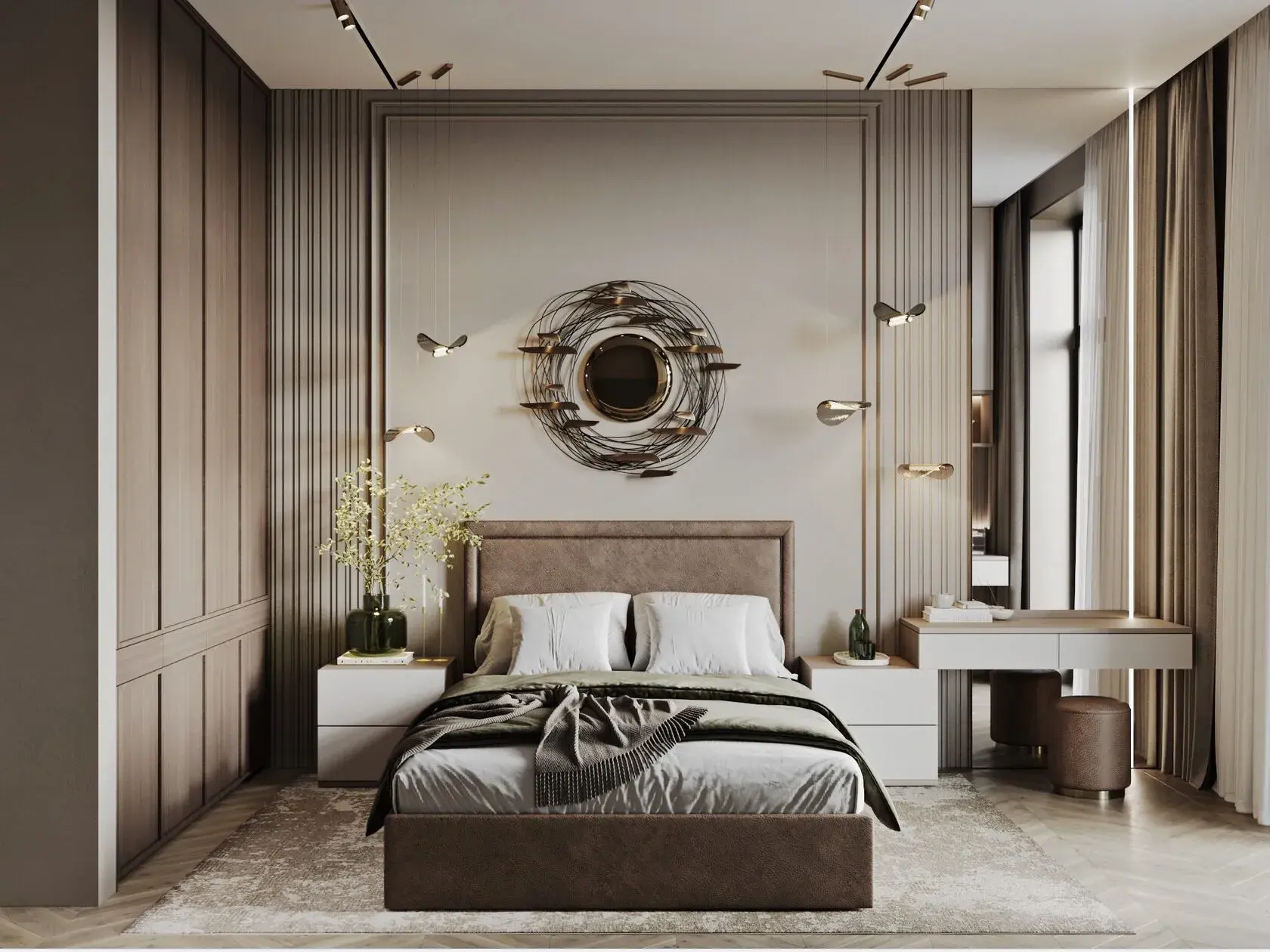 Цветовая палитра спальни задаёт эмоциональный фон. Резкие контрасты и очень яркие оттенки уместны далеко не всегда. Для интерьеров, ориентированных на отдых, чаще выбирают спокойные, приглушённые оттенки, которые не утомляют взгляд. Нейтральные тона можно сочетать с более глубокими, но всё равно мягкими цветами в текстиле или отдельных акцентах.
