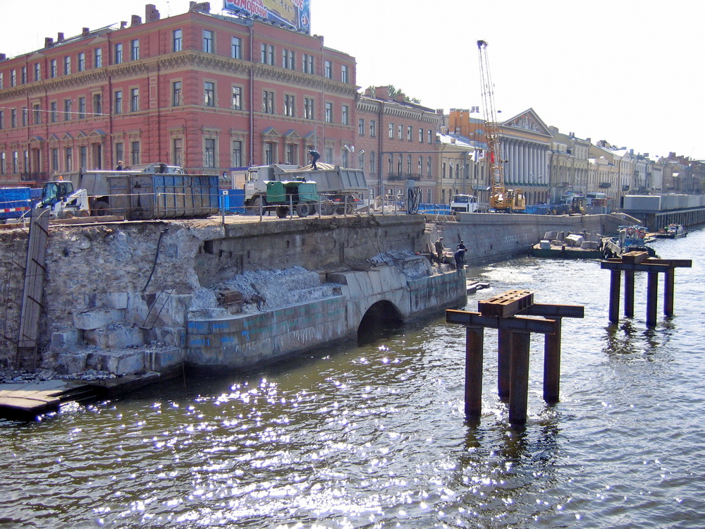 Благовещенский мост открыли в 1850 году. Вход в коллектор выполнили в составе его левобережного устоя: там появилась гранитная арка. И она сохраняется до сих пор, увидеть ее можно, например, с катера. А в 2006 году посмотреть на эту арку мог любой желающий: на время сноса старого Благовещенского моста рядом с ним возвели переправу-дублер, и с нее открывался вид на эту арку.