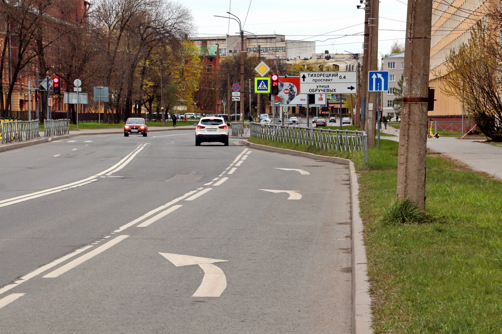 Улица Гидротехников перед перекрестком с улицей Обручевых изгибается с обеих сторон. Такая конфигурация связана с тем, что прежде она обходила здание.