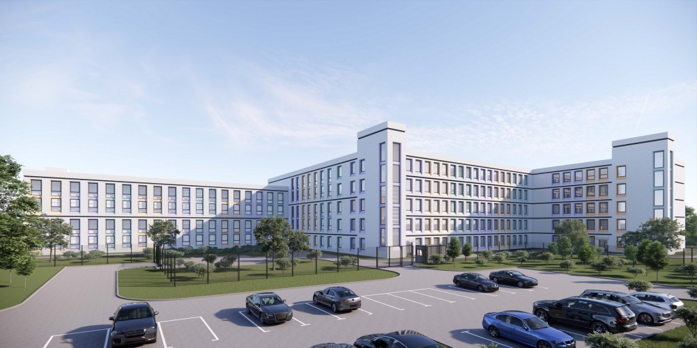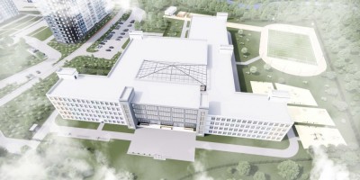 «Основным стилистическим приемом является визуально выступающий центральный блок, выполненный из серого облицовочного кирпича и витражного остекления, который контрастирует с остальными блоками, выполненными из тонкослойной фасадной штукатурки белого цвета», — пояснили в КГА.