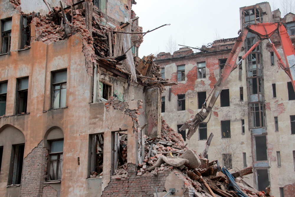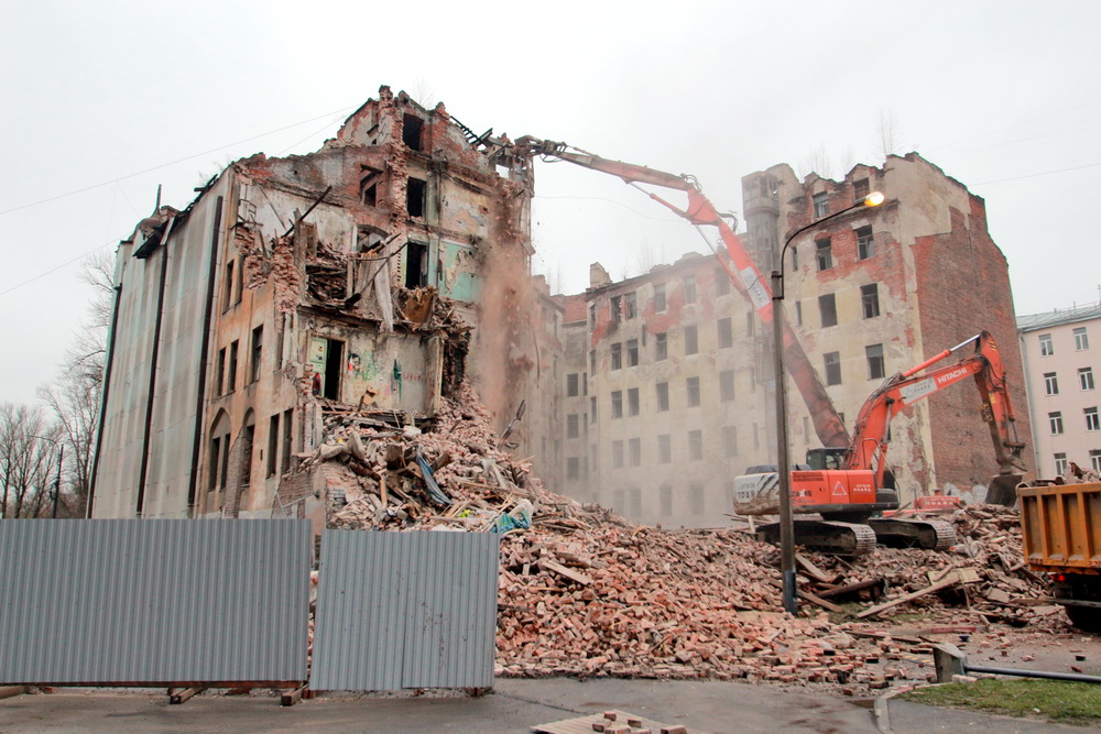 В эти минуты ведется частичная разборка дома. На объекте работает техника ООО «СК „Прайд“», входящего в группу «Прайд». Объем сноса, по данным «Канонера», будет оцениваться в процессе.