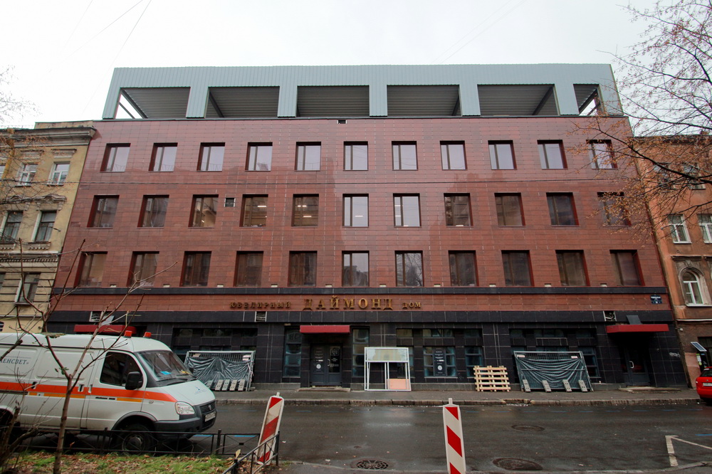 Четырехэтажное нежилое здание было построено в 1967 году. Не позднее 2000-х его облицевали полированной плиткой. Внутри, судя по вывеске, с тех пор работает «ювелирный дом „Даймонд“».