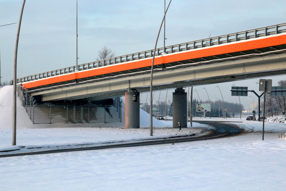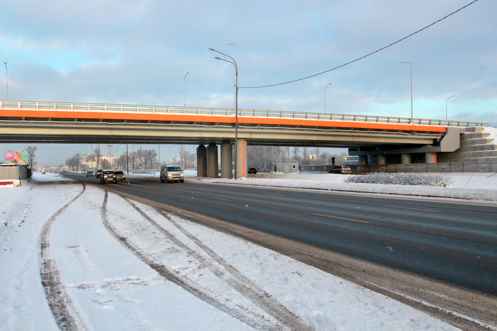 Вчера состоялось открытие движения. Новая дорога имеет четыре полосы, по две в каждую сторону. Над Пулковским шоссе в районе развязки с дорогой на аэропорт построили Y-путепровод: он в едином четырехполосном виде нависает над Пулковским, а западнее его разделяется на два двухполосных «хвоста». Фасады моста выкрасили в фирменный оранжевый цвет. Еще один путепровод построили над самой платной магистралью в створе новой дороги.