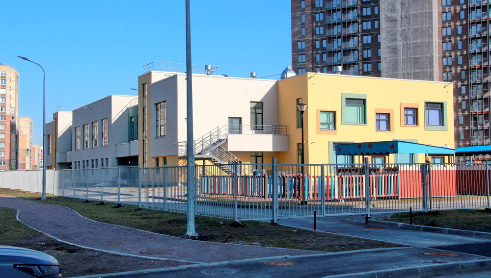 Во дворах на Юнтоловском проспекте сдали надворный детский сад в «стиле» хаотизм. Он стал частью микрорайона Юнтолово, который в тех краях возводит группа «Главстрой».