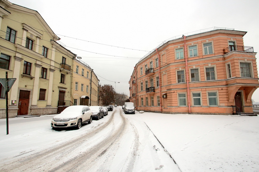 Северный фасад дома на Приморском проспекте, 25, как бы намекает на то, что исторически он выходил на некую улицу. Называлась она Новодеревенской, или Ново-Деревенской.