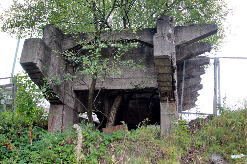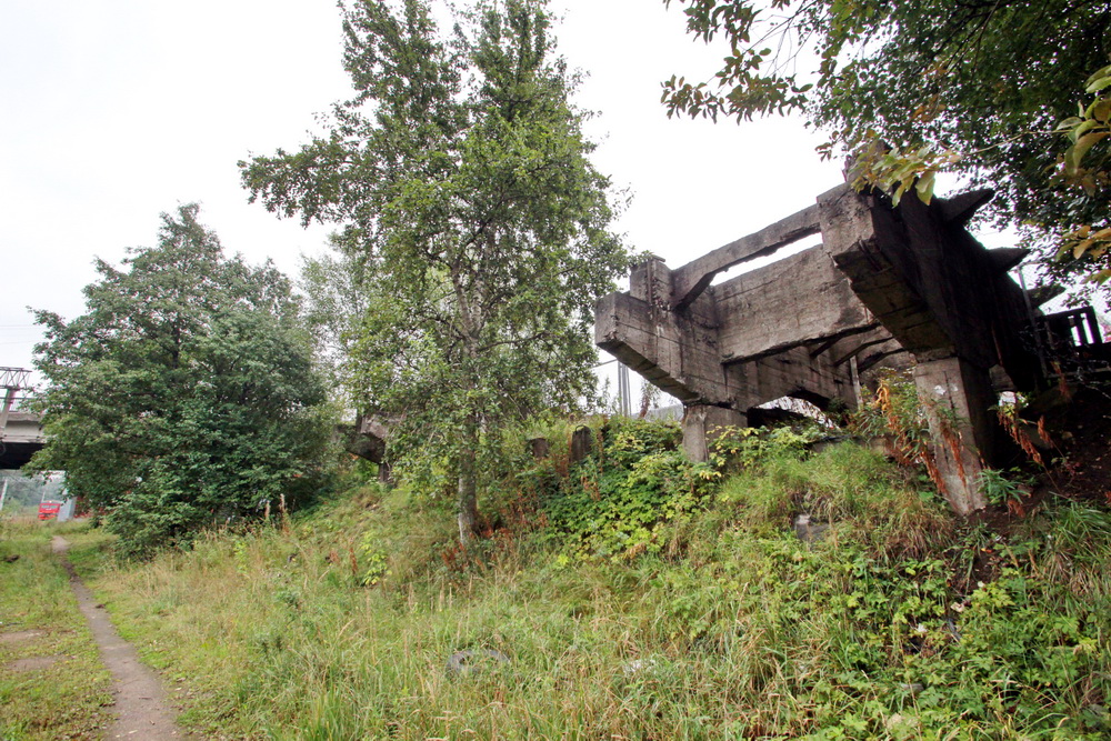 Чуть западнее Кушелевского путепровода сохраняются железобетонные опоры. Это остатки непостроенного путепровода.