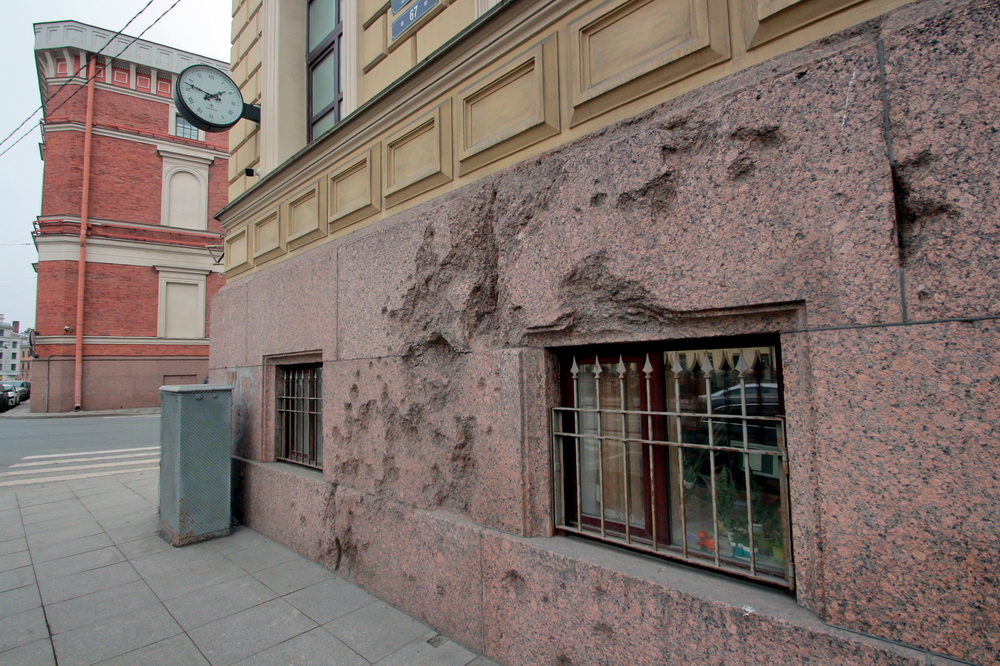 Убирать выщербины на гранитном цоколе офицерского корпуса, расположенного на углу улицы Труда и Большой Морской улицы на берегу Мойки, не будут. Их происхождение неясно; по некоторым данным, это может быть эхо войны.
