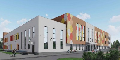 Во дворах на улице Лермонтова в Красном Селе построили школу-детсад. Ее фасады выполнили в «стиле» хаотизм.